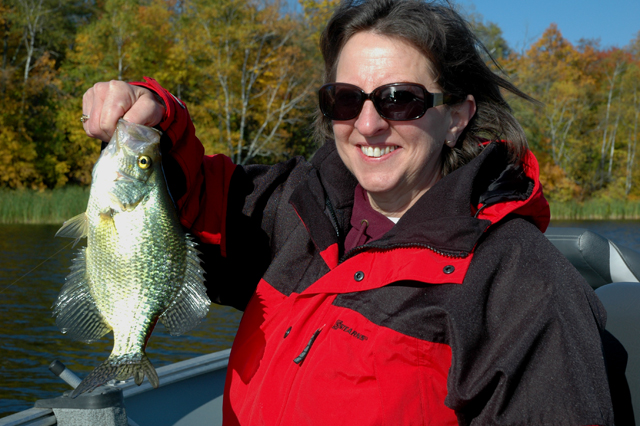 Crappies are among the fish helping to put smiles on our faces. Karen Hommedahl bagged this one on Cutfoot Sioux.
